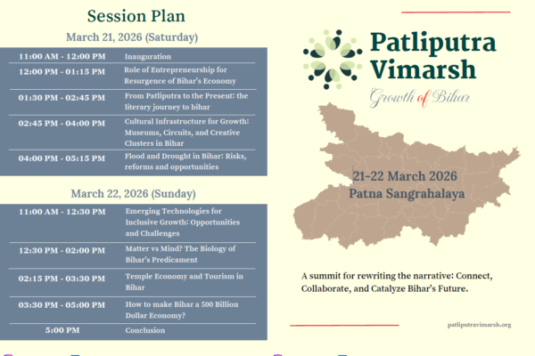 पटना, 23 मार्च: ऐतिहासिक पटना संग्रहालय (जादूघर) में पाटलिपुत्र विमर्श समिति द्वारा 21-22 मार्च को दो दिवसीय संवाद कार्यक्रम का आयोजन किया गया जिसमें विभिन्न उच्च शिक्षण संस्थाओं के छात्र-छात्राओं, विभिन्न क्षेत्रों के विशेषज्ञों, शिक्षाविदों, नीति-निर्माताओं एवं बुद्धिजीवियों समेत 300 से अधिक लोगों ने हिस्सा लिया। “पाटलिपुत्र विमर्श 2026” कार्यक्रम के पहले दिन श्री प्रेम…