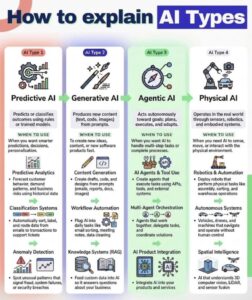 आर्टिफिशियल इंटेलिजेंस का विकास एक सीधी रेखा में नहीं है, बल्कि यह अलग-अलग शाखाओं में फैल रहा है। जहाँ प्रेडिक्टिव AI हमें बेहतर निर्णय लेने में मदद करता है, वहीं जेनरेटिव AI हमारी रचनात्मकता को बढ़ाता है। एजेंटिक AI हमारे जटिल कार्यों का बोझ कम करता है, और फिजिकल AI मशीनों को हमारे भौतिक संसार का हिस्सा बनाता है। भविष्य में इन चारों प्रकारों का संगम हमारे काम करने और जीने के तरीके को पूरी तरह बदल देगा।